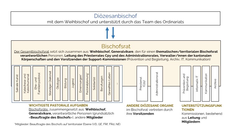 Die Verantwortlichen dieser thematischen Bischofsräte (häufig «Beauftragte des Bischofs» genannt) werden sich in Anwesenheit weiterer Mitglieder (vgl. Schema) mehrmals jährlich im Rahmen des Gesamtbischofsrates treffen, der so für die gesamte Pastoral des Bistums zuständig wird.