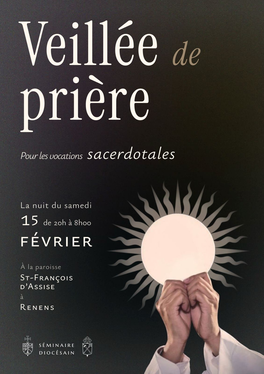 Nos séminaristes invitent à une veillée de prière pour les vocations sacerdotales la nuit du samedi 15 février 2025, à partir de 20h, en l’église Saint François d’Assise de Renens. Ce temps d’adoration se conclura par la célébration de la messe à 8h, le 16 février.
